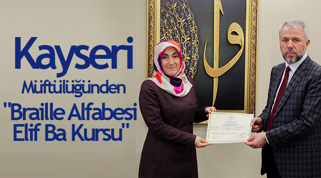Kayseri İl Müftülüğü Engelliler Koordinatörlüğünce personele yönelik "Braille Alfabesi ile Elif BaKursu" düzenlendi.64 saatlik “Braille Alfabesi ile Elif Ba Kursu" Melikgazi Silver Kur’an Kursunda yapıldı.Aralarında vaiz, psikolojik danışmanlık ve rehberlik uzmanı ile Kur’an kursu öğreticilerinin yer aldığı 25 kursiyer, "Braill Alfabesi ile Elif Ba Kursu"nu tamamlayarak sertifika almaya hak kazandı. Sertifika programında konuşan İl Müftüsü Prof. Dr. Şahin Güven, “Personelimizin daha donanımlı olması için çeşitli kurslar ve seminerler düzenlemekteyiz. İnsanlara hizmet verirken gerekli olan donanımı ve alt yapıyı oluşturmak için gerçekleştirilen böyle güzel bir kursa katılımlarından dolayı siz değerli kursiyerlerimize ve kurs hocalarımıza teşekkür ediyorum.” dedi.Konuşmaların ardından kursiyerlere Kurs Katılım Belgeleri takdim edildi.
