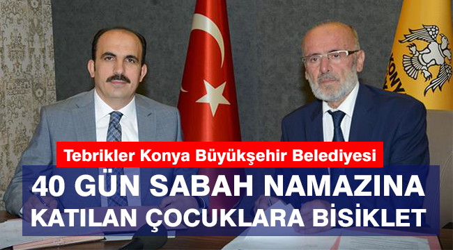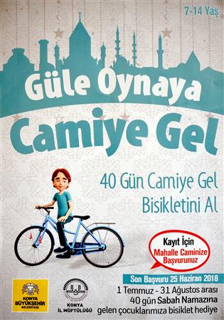 Konya Büyükşehir Belediyesi Konya genelindeki tüm camileri kapsayan “Güle Oynaya Camiye Gel” projesini başlatıyor. Büyükşehir Belediyesi, Temmuz ve Ağustos aylarında 40 gün boyunca camide sabah namazına giden tüm çocuklara bisiklet hediye edecek. Konya Büyükşehir Belediye Başkanı Uğur İbrahim Altay ve Konya İl Müftüsü Ahmet Poçanoğlu ilgili projenin protokolünü Konya Büyükşehir Belediyesinde imzaladı.