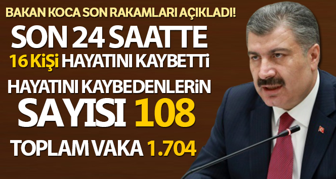 Sağlık Bakanı Fahrettin Koca, Türkiye'nin korona virüs tablosunu paylaştı. Tabloya göre, son 24 saatte 16 kişi hayatını kaybetti, can kaybı toplam 108 kişi oldu. Son 24 saatte 7 bin 641 test yapıldı, yeni vaka sayısı ise bin 704 oldu. Toplam iyileşen sayısının ise 70 kişi olduğu belirtildi.