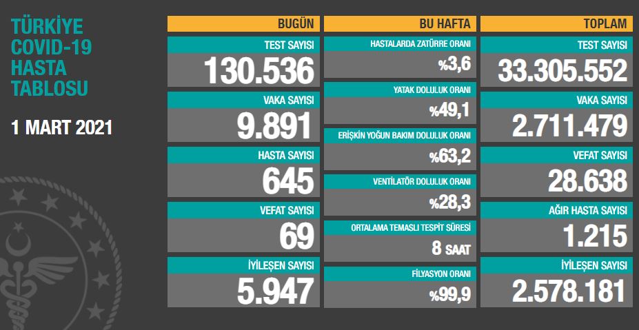Toplamda 33 milyon 305 bin 552 test yapıldı. Bugün yapılan 130 bin 536 testten 9 bin 891 yeni vaka sayısı, 645 de yeni hasta sayısı olduğu belirtildi. Toplam vaka sayısının 2 milyon 711 bin 479 olduğu, bugün iyileşen 5 bin 947 kişiyle birlikte toplam iyileşen hasta sayısının 2 milyon 578 bin 181'e yükseldiği, toplam hastalarda zatürre oranının yüzde 3,6, ağır hasta sayısının ise bin 215 olduğu açıklandı.
