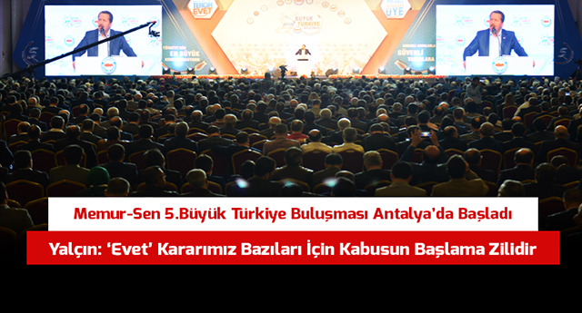Memur-Sen 5. Büyük Türkiye Buluşması Antalya’da büyük coşkuyla başladı. Programda konuşan Memur-Sen Genel Başkanı Ali Yalçın, “. ‘Evet’e irtifa kaybettirme telaşıyla görsel efektlerle kazandıkları itibarlarını kaybettiler. ‘Evet’i engelleme mücadelesinde de kaybedecekler. Artık tilkinin vaazını dinlerken tavuklarını yitiren Eski Türkiye’yi kaybettiklerini bellediler. Yeni Türkiye’nin kuruluşuna engel olalım derken, AB’nin çöküşünü, yıkılışını hızlandırma butonuna bastılar. Bizim kararlılığımız, Tercih ‘Evet’ kararımız onlar için kâbusun başlama zilidir” dedi.