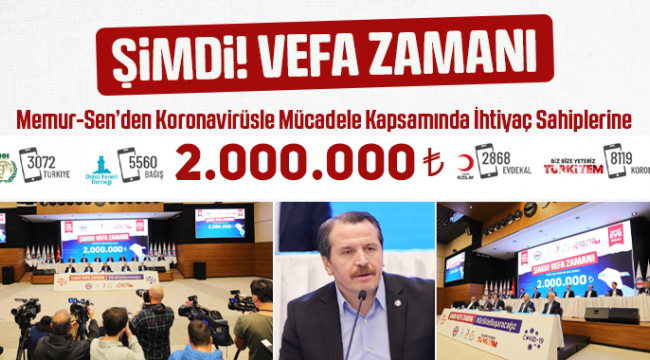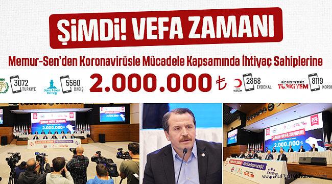 Memur-Sen Konfederasyonu koronavirüsle mücadele kapsamında, Cumhurbaşkanı Erdoğan’ın çağrısıyla başlatılan “Milli Dayanışma Kampanyası”na 1 milyon TL, “Şimdi Vefa Vakti” kampanyasıyla da İHH, Deniz Feneri ve Kızılay’a 1 milyon TL olmak üzere toplamda 2 milyon TL’lik bağışta bulundu. Memur-Sen Genel Merkezi’nde gerçekleştirilen basın açıklamasıyla toplamda 2 milyon TL’lik bağış gerçekleştirildi. Memur-Sen Genel Başkanı Ali Yalçın, Aile, Çalışma ve Sosyal Hizmetler Bakan Yardımcısı Adnan Ertem, İHH Genel Başkanı Bülent Yıldırım, Kızılay Genel Başkanı Kerem Kınık, Deniz Feneri Derneği Başkanı Mehmet Cengiz ve Memur-Sen’e bağlı 11 sendikanın genel başkanlarının katılımıyla kampanyanın duyurusu yapıldı.Burada konuşan Genel Başkan Ali Yalçın, bütün dünyada hissedilen ve insanı ilgilendiren her konuyla ilgili doğrudan, etkili ve yıkıcı sonuçlar üretme kapasitesine sahip koronavirüs salgınıyla karşı karşıya olduklarını ifade ederek, Türkiye’nin ilk andan itibaren gerek milletin hassasiyeti ve gerekse devletin ortaya koyduğu mücadele sayesinde salgına karşı idari ve insani tedbirler noktasında önemli mesafeler kaydettiğini ifade etti.Konuşmasında Yalçın, “Özellikle sağlık hizmetlerini sunan kamu görevlisi arkadaşlarımıza, sağlık çalışanlarımıza; bu süreçte sağlık çalışanı sıfatını anne, baba, evlat, eş ve kardeş sıfatlarının önüne koymak noktasındaki emsalsiz fedakârlıklarından dolayı minnettarız” ifadelerini kullandı.Herkes Salgınla Mücadele Noktasında Evde Kalmalı“İnsan-İnsan temasının en aza indirilmesine yönelik tedbirlerin doğal sonuçlarından biri hiç kuşkusuz; üretim süreçlerinin, ticari ve sınai faaliyetlerin, eğitim başta olmak üzere birçok kamu hizmeti ile bu hizmetlerle ilişkili birçok özel sektör faaliyetinin durmasıdır” diyen Yalçın şöyle devam etti: “Günlük çalışan, günlük kazanan ve ihtilacını karşılayan birçok insan, ihtiyaçlarını karşılayacak gelirden mahrum durumdalar. İnsanlar, hayatlarını sürdürmek için çalışmak, hayatta kalmak için ise evde kalmak zorundalar. Bu çelişkinin ürettiği ve üreteceği mağduriyetlere gözlerimizi kapayamayız. Kesinlikle uyulması gereken bir husus var; zorunlu olmadıkça herkes salgınla mücadele noktasında ‘evde kal’malı. Fakat yine kesinlikle olması gereken bir başka husus daha var; hiç kimse salgınla mücadele sürecinde de zorda kalmamalı, yalnız kalmamalı, darda kalmamalı. Hayatı eve sığdırdığımız bugünlerde insanlığı, vefayı, yardımlaşmayı ve dayanışmayı da vakte sığdırmalıyız. Salgın sürecinin zihinlerimize kazıdığı eylem infak, yüreklerimizde yaşattığı değer vefa olmalı. Vefa, ‘niye’ sorgusunun gereksiz, infak ‘kime’ sorusunu anlamsız görerek el vermek, omuz vermek, gönül ve değer vermektir.”Memur-Sen Yöneticilerinden Birer Maaş BağışAyrıca başta Memur-Sen Konfederasyonu Genel Başkanı Ali Yalçın olmak üzere Memur-Sen’e bağlı sendikaların genel başkanları da kampanyaya 1 aylık maaşlarını bağışladılar.Ertem: Kampanyanın Büyük Bir Fayda Sağlayacağını DüşünüyoruzAile, Çalışma ve Sosyal Hizmetler Bakan Yardımcısı Adnan Ertem yaptığı konuşmada virüs salgınının insanları evde kalmaya zorladığını ifade ederek, “Bu kapsamda bu kampanyanın büyük fayda sağlayacağını düşünüyoruz. Devlet olarak konuya ilişkin birçok paket açıkladık. Yardımların da bu noktada önemli bir rol oynayacağını düşünüyoruz. Ben bu kampanyada emeği geçen başta Memur-Sen olmak üzere tüm kurumlara teşekkürlerimi sunuyorum” diye konuştu. Kampanyanın ismi kadar niteliğinin de doygun olduğunu kaydeden Ertem, “İnanıyorum ki bu kampanyayla birçok kişiye yardım ulaşacaktır. Bakanlığımız adına bir kez daha emeği geçen herkese müteşekkiriz” ifadelerini kullandı.Yıldırım: İnsanlık Bu Salgını da AtlatacakTürkiye’nin açıkladığı paketler ve başlattığı kampanyalarla kendi kendine yetmeye kararlı olduğunu gösterdiğini ifade eden İHH Genel Başkanı Bülent Yıldırım, bunun çok değerli olduğunu belirtti.İnsanlığın bu salgını elbette atlatacağını ifade eden Yıldırım, paniğe kapılmadan, dik durarak bu günlerin geride bırakılabileceğini kaydetti. Yıldırım, önemli olan değerlerin korunması olduğuna da sözlerine ekleyerek, programdan ötürü Memur-Sen’e müteşekkir olduklarını söyledi.