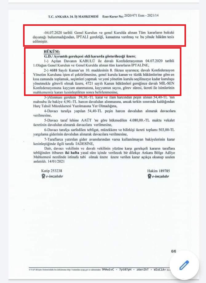 Diyanet-Sen Malatya Şube Başkanı Mehmet Engin Mil-Sen Konfederasyona mahkemeden kayyum kararı çıktığını açıkladı.Mahkeme kararı ile ilgili Basın açıklaması yapan Diyanet-Sen Malatya Şube Başkanı ERGİN; Manevi İlkeli Liyakatli Sendikalar Konfederasyonu olarak faaliyet gösteren ve Mil-Diyanet Sen, Mil-Sağlık Sen, Mil-Eğitim Sen gibi sendikalarında aralarında bulunduğu 6 sendika ile konfederasyon olan ilk olağan genel kurulunu 04.07.2020 tarihinde gerçekleştiren konfederasyona mahkemeden kayyum kararı çıktığını söyledi.Başkan ERGİN ,Mahkemenin kararında 04.07.2020 tarihli genel kurulunun ve alınan kararların hukuki dayanağının bulunmadığından iptaline karar verildiğini, Ankara 34. İş Mahkemesi tarafından verilen kayyum kararında 4688 Sayılı Kanunun 10. Maddesinin 8. Fıkrası uyarınca Mil-Sen Yönetim Kuruluna işten el çektirilmesine ve genel kurulun mevzuata uygun bir şekilde yapılması için 4721 sayılı kanun gereğince Mil-Sen konfederasyonuna kayyum atanmasına karar verildiğini ifade etti.
