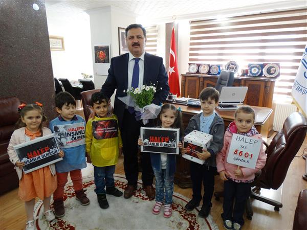 Eskişehir Odunpazarı Hacı Havva Camii Hafız Mehmet Sarıcaoğlu 4-6 Yaş Kur’an Kursu öğrencilerinden oluşan bir grup minik öğrenci, Halep’te binlerce insanın öldürüldüğü katliama dikkat çekmek ve onların yaralarına bir nebze olsun merhem olabilmek için harçlıklarıyla ve kumbaralarında 2 ayda topladıkları paraları teslim etmek için Hocalarıyla birlikte Odunpazarı Müftüsü Burhan ÇAKIR’ı makamında ziyaret ettiler.