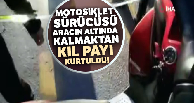 Motosiklet sürücüsünün aracın altında kalmaktan kıl payı kurtulduğu anlar kamerada