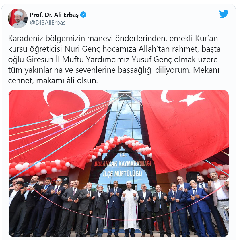 Başta Giresun olmak üzere Karadeniz bölgesinin önemli kanaat önderlerinden emekli Kur'an Kursu öğreticisi, Giresun İl Müftü Yardımcısı Yusuf Genç'in babası Genç hoca Hakk'a yürüdü. Başkan Erbaş'tan Taziye Mesajı:Diyanet İşleri Başkanı Prof. Dr. Ali Erbaş, emekli Kur'an Kursu Öğreticisi nuri genç Hoca için kişisel sosyal medya hesaplarından bir taziye mesajı yayınladı.Erbaş mesajında şu ifadelere yer verdi:
