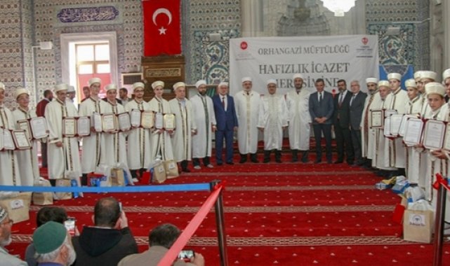 Bursa Orhangazi İlçe Müftülüğüne bağlı Ertuğrulgazi Yatılı Kuran Kursu'nda hafızlık eğitimini tamamlayan 15 öğrenci için "Hafızlık İcazet Merasimi" düzenlendi.