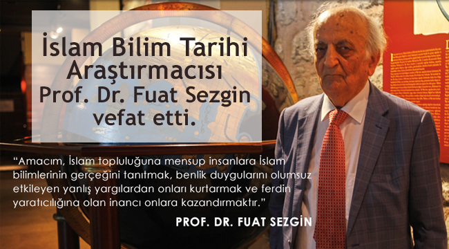 Dünyanın önde gelen tarihçilerinden İslam bilim tarihi araştırmalarına ömrünü adayan ve başta hadis alanında Buhari’nin Kaynakları adlı eseri olmak üzere pek çok dilde eserler veren Prof. Dr. Fuat Sezgin (94) tedavi gördüğü hastane de vefat etti.Merhumun cenazesi yarın(01.07.2018 )öğle namazına müteakip Süleymaniye Camisi'nde kılınacaktır.Hocamıza Allahtan rahmet diliyoruz.İlim aleminin başı sağolsun.Ruhu şad olsun.