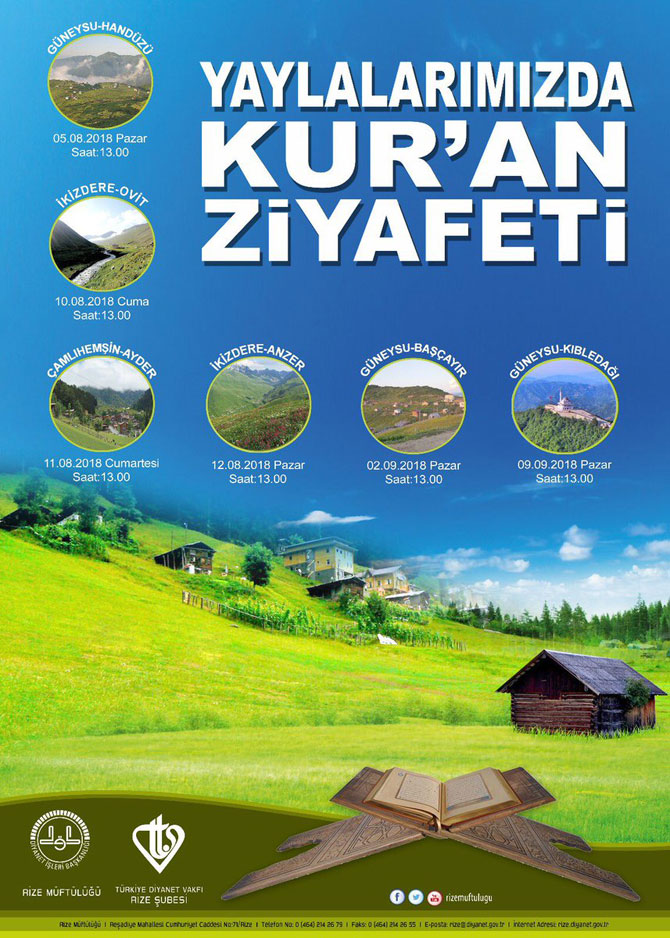 Rize Müftülüğü tarafından 2016 yılında başlatılan ve geleneksel hale getirilen “Yaylalarımızda Kur’an Ziyafeti” programları 5 Ağustos ile 9 Eylül 2018 tarihleri arasında 3 ilçede 6 ayrı yaylada gerçekleştirilecek.5 Ağustos Pazar günü Güneysu Handüzü Yaylasında düzenlenecek programla başlayacak olan “Yaylalarımızda Kur’an Ziyafeti”, 9 Eylül Pazar günü Güneysu Kıbledağı programı ile sona erecek.Rize’nin yetiştirdiği güzide hafızlarla misafir hocalar tarafından yaşatılacak eşsiz atmosferi hep birlikte solumak amacıyla Rize İl Müftülüğü tarafından vatandaşlara Kur’an ziyafetlerine katılım sağlamaları için davette bulunuldu.2018 YILI YAYLA KUR’AN ZİYAFETİ PROGRAMLARI ŞÖYLE:5 Ağustos Pazar günü Saat:13.00 Güneysu Handüzü10 Ağustos Cuma günü Saat:13.00 İkizdere Ovit11 Ağustos Cumartesi günü Saat:13.00 Çamlıhemşin Ayder12 Ağustos Pazar günü Saat:13.00 İkizdere Anzer2 Eylül Pazar günü Saat:13.00 Güneysu Başçayır9 Eylül Pazar günü Saat:13.00 Güneysu Kıbledağı