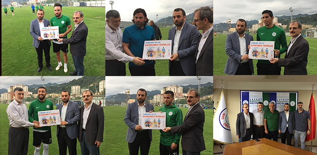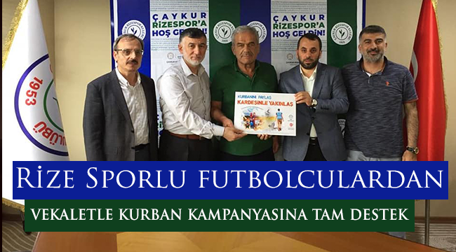 Türkiye Diyanet Vakfı’nın “Kurbanını Paylaş Kardeşinle Yakınlaş” sloganıyla başlattığı vekâlet yoluyla Kurban bağışı kampanyasına bir destek te Süperlig takımı Çaykur Rizespor’dan geldi.Kampanya tanıtımı çerçevesinde İl Müftü Vekili Naci Çakmakçı, beraberindeki İl Müftü Yardımcısı Abdullah Köseoğlu ve TDV Rize Şubesi Yönetim Kurulu Üyesi Reşit Karavin ile birlikte Çaykur Rizespor Kulübü Başkanı Hasan Kemal Yardımcı'yı ziyaret etti.İl Müftü Vekili Naci Çakmakçı kampanya hakkında bilgi vererek, hayırseverlerin destek ve katkılarıyla yurt içinde 280 kesim bölgesinde, yurt dışında ise 145 ülkenin 436 bölgesinde vakfımıza emanet edilen kurbanların islami usullere uygun şekilde kesildiğini, ülkemizdeki ihtiyaç sahiplerinin yanı sıra kıtlık ve kuraklıkla mücadele eden ülkelere ulaştırıldığını ifade etti.Çaykur Rizespor Kulübü Başkanı Hasan Kemal Yardımcı ise “Hayırda öncü ve örnek olma adına bizleri böylesi bir anlamlı kampanyaya dahil eden Türkiye Diyanet Vakfı’na teşekkür ediyor, yönetim olarak futbolcularımızla birlikte kampanyayı destekliyor ve bu kampanyaya tüm Rizelilerin ilgisini bekliyoruz” dedi.Teknik Direktör İbrahim Üzülmez ve futbolcular kampanyaya destekte bulunarak, taraftarları ve futbolseverleri “Kurbanını Paylaş Kardeşinle Yakınlaş” sloganıyla kampanyayı desteklemeye davet ettiler.