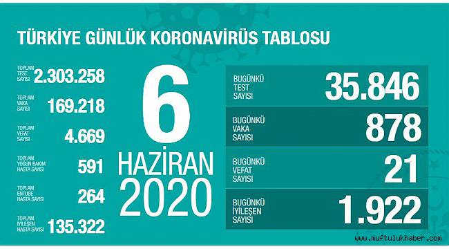 Sağlık Bakanlığından yapılan açıklamaya göre, son 24 saatte 21 kişi korona virüsten hayatını kaybetti, toplam can kaybı ise 4 bin 669'e yükseldi. Bugün toplam 35 bin 846 test yapılırken, 878 yeni vaka tanısı konuldu, toplam vaka sayısı ise 169 bin 218 oldu.Bugünkü bin 922 kişiyle birlikte toplam iyileşen sayısı da 135 bin 322'e yükseldi. Toplam entübe hasta sayısının 264, toplam yoğun bakım hasta sayısının ise 591 olduğu açıklandı.Sağlık Bakanı Fahrettin Koca, Twitter'dan yaptığı paylaşımda, “Toplam vakaların yüzde 80'i iyileşti. Yeni iyileşen hasta sayımız 2 bine yakın. Pozitif tanı konan hastaların büyük kısmı hastalığı belirtisiz ve evde geçiriyor. 81 ilimizde Covıd-19 sebebiyle dün yatan hasta sayısı 41. Daha iyi tedbir, daha iyi sonuçtur” dedi.