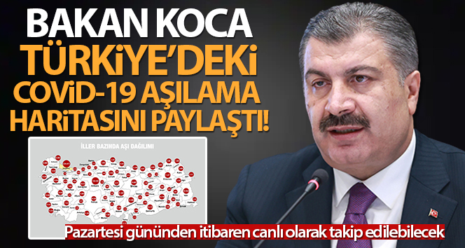 Sağlık Bakanı Fahrettin Koca, sosyal paylaşım sitesi Twitter üzerinden yaptığı paylaşımda, “1 milyon 200 binden fazla kişi şu ana kadar aşı oldu. Türkiye'de iller bazında aşı dağılımını görebilirsiniz. Pazartesi gününden itibaren bunu canlı olarak takip edebileceksiniz. En çok sağlık çalışanımızın bulunduğu İstanbul'da 224.000'den fazla kişi aşı oldu” ifadelerini kullandı. Bakan Koca ayrıca paylaşımına Türkiye'deki Covid-19 aşılama haritasını da ekledi.
