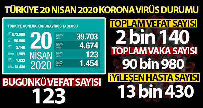 Sağlık Bakanlığından yapılan açıklamaya göre, son 24 saatte 123 kişi korona virüsten hayatını kaybettiği, toplam can kaybı 2 bin 140 oldu. Bugün toplam 39 bin 703 test yapılırken, 4 bin 674 yeni vaka tanısı konuldu, toplam vaka sayısı 90 bin 980 oldu.