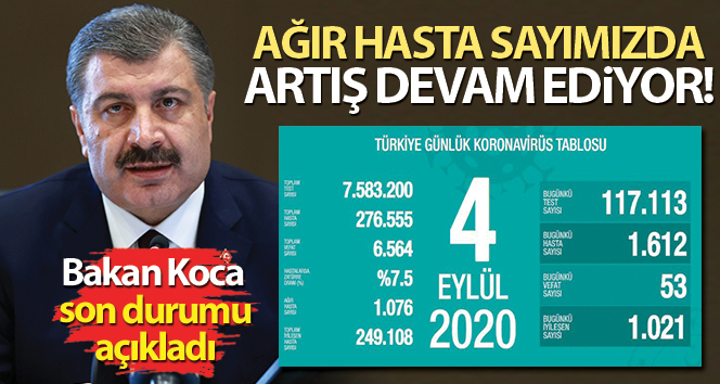Sağlık Bakanı Fahrettin Koca, sosyal paylaşım sitesi Twitter hesabından yaptığı paylaşımda, “Bugün 200 laboratuvarda 117.113 yeni test yapıldı. Ağır hasta sayımızda artış devam ediyor. İyileşen hasta sayımız halen yeni hasta sayımızdan az. Dönem mücadele ve tedbirde güç birliği dönemidir. Birlik olalım” ifadelerine yer verdi.