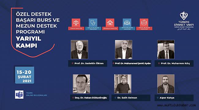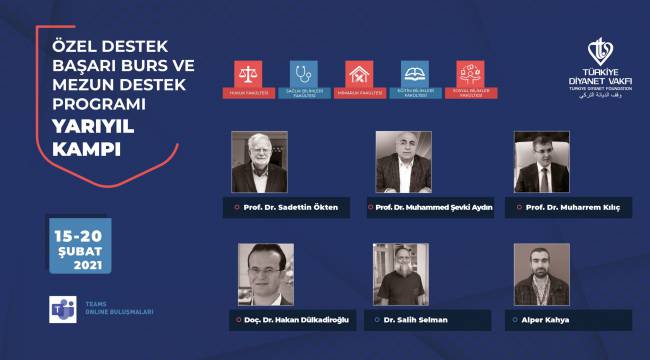 Türkiye diyanet Vakfının yurtiçi ve uluslararası burslar kapsamında Özel Destek Başarı Burs ve Mezun Destek Programı öğrencilerine yönelik düzenlediği çevrimiçi kamp bugün başladı. Tıp, mühendislik, mimarlık, hukuk, sosyal bilimler ile eğitim alanlarında eğitim gören 480 öğrencinin katıldığı kamp programı Microsoft Teams uygulaması üzerinden yapılacak ve 20 Şubat tarihinde sona erecek.Müslümanca duruş, iş ahlakı, mesleki tecrübeler ve kazanmalar, iş hayatına dair konu başlıklarının işleneceği kamp programı kapsamında öğrenciler kendi alanlarıyla ilgili hazırladıkları atölye çalışmalarını hafta boyu sunacak. Ayrıca alanlarında uzman eğitimcilerin farklı konulardaki seminer ve söyleşileri de kamp boyunca öğrenciler tarafından izlenebilecek.Kampı değerlendiren Türkiye Diyanet Vakfı Mütevelli Heyeti II. Başkanı İhsan Açık, koronavirüs nedeniyle alınan tedbirler kapsamında öğrencilerin evlerinden ve yurtlardan mobil cihaz ya da bilgisayarları aracılığıyla kampa katılabileceğini belirtti. Öğrencilerin kişisel gelişimi ve mesleki gelişimi açısından kampların büyük önem taşıdığını ifade eden İhsan Açık, kaydedilen derslerin istenilen zamanda tekrar dinlenebileceği dile getirdi.
