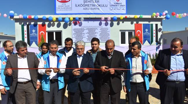 Türkiye Diyanet Vakfı bölgede eğitim, kalkınma, sağlık, tarım ve hayvancılık alanlarında kalıcı ve sürdürülebilir projeleri uygulamaya devam ediyor.Vakıf, Suriye’nin kuzeyinde yer alan Azez’deki Mukaveme Kampı'nda 22 derslikli ilköğretim okulu açtı.Diyanet İşleri Türk İslam Birliği (DİTİB) Köln Bölge Dernekleri sponsorluğunda TDV tarafından yapılan eğitim kurumuna Şehitler İlköğretim Okulu adı verildi. Tüm araç ve gereçleri vakıf tarafından temin edilen okulda, 22 derslik ve idari bölümler bulunuyor.Yaklaşık bin 800 öğrencinin eğitim alacağı okulda 45 personel görev yapacak. Okulda ikili eğitim verilecek.Okulun açılışı amacıyla düzenlenen törene, TDV ve Kilis Müftülüğü ile DİTİB Köln Bölge Dernekleri yetkilileri katıldı.Kur'an-ı Kerim tilavetiyle açılışı yapılan okuldaki öğrencilere kırtasiye seti dağıtıldı.Türkiye Diyanet Vakfı Suriye Çalışmaları Sorumlusu Mahmut Temelli, 4 bin ailenin yaşadığı kampta çocukların çadırlarda eğitim aldığını belirterek "Allah'a hamdolsun Almanya’daki bağışçılarımızın göndermiş olduğu yardımlarla 22 sınıfı bulunan okul yaptık." dedi.Temelli, katkılarından dolayı bağışçılara teşekkür ederek vakıf olarak Suriye’de eğitim alanında çalışmalara devam edeceklerini kaydetti.Okul Müdürü Adil Karme de kamptaki çocukların çadırlarda eğitim almak zorunda kaldığını söyleyerek "Yaz ve kış aylarında çadırda eğitim çok zor oluyordu. Geleceğimizi inşa edecek bu çocukların rahat bir okulda okumasına vesile olan Türkiye’ye teşekkür ederim." ifadelerini kullandı.Kampta yaşayan Ebu Muhammed, üç çocuğunu okula gönderdiğini belirterek çadırda eğitim aldıkları için çocukların sürekli hasta olduğunu, yeni okulun açılmasıyla çocukların daha iyi koşullarda eğitim göreceğini kaydetti.