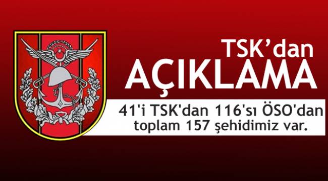 Milli Savunma Bakanı Nurettin Canikli, Afrin'de 41'i Türk Silahlı Kuvvetlerinden 116'sı ÖSO'dan olmak üzere toplam 157 şehidimizin olduğunu açıkladı.İstanbul'da Zeytin Dalı Harekatı'yla ilgili konuşan Milli Savunma Bakanı Nurettin Canikli "Maalesef 41 Türk Silahlı Kuvvetlerimizden, 116 ÖSO mensubu olmak üzere toplam 157 şehidimiz var" dedi.