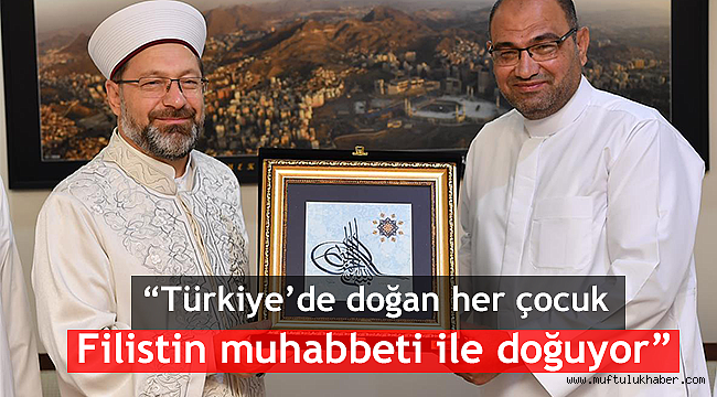 Diyanet İşleri Başkanı Prof. Dr. Ali Erbaş, Filistin Evkaf Bakanı Hasan Es Sayfi’yi kabul etti.Mekke’de Din Hizmetleri Ataşelik binasında gerçekleştirilen görüşmede diyanet İşleri Başkanı Erbaş, ziyaretten duyduğu memnuniyeti dile getirerek, Filistin’in gönüllerinde ayrı bir yeri olduğunu söyledi.Başkan Erbaş, kendileri için Filistin’i İstanbul’dan, Mekke ve Medine’den bir farkı olmadığını ifade ederek, “Çocuklarımıza, gençlerimize bu ruhu aşılamaya çalışıyoruz. Türkiye’de doğan her çocuk Filistin muhabbeti ile doğuyor. İnşallah böyle de devam edecektir” dedi.İstanbul’da “Uluslararası Kudüs Zirvesi” yaptıklarını dile getiren Başkan Erbaş, zirvede tüm dünyaya Kudüs’te yaşanan bütün sıkıntıların çözümüne dair önemli çağrılarda bulunduklarını kaydetti. Müslümanların Kudüs’te daha fazla görünür olması için Kudüs ziyareti ve Kudüs bağlantılı umre ziyaretlerinin arttırılmasının da zirvenin sonuç bildirgesin de yer aldığını belirterek “Bu çağrımızın sonuç verdiğini görmek bizi mutlu ediyor” diye konuştu.Müslümanların birliği ve beraberliği için ellerinden gelen gayreti göstereceklerini ifade eden Başkan Erbaş, “Eğitim konusunda Türkiye’de Filistinli gençlerin çeşitli üniversitelerde okutulması için her türlü desteği vermeye hazır olduklarını kaydetti.Filistin Evkaf Bakanı Hasan Es Sayfi ise kabulden dolayı Başkan Erbaş’a teşekkür etti. Başkan Erbaş’a Filistin halkının selamlarını ileten Sayfi, “Gazze Halkı Türkiye’nin durumunu yakından takip ediyor. Çünkü İslam ülkeleri içerisinde onlar için dayanak olarak sadece Türkiye’yi görüyorlar” dedi.Kabulde, Diyanet İşleri Başkan Yardımcıları Osman Tıraşçı ile Prof. Dr. Ramazan Muslu, Hac ve Umre Hizmetleri Genel Müdürü Enver Günenç, Dış İlişkiler Genel Müdürü Erdal Atalay da hazır bulundu.