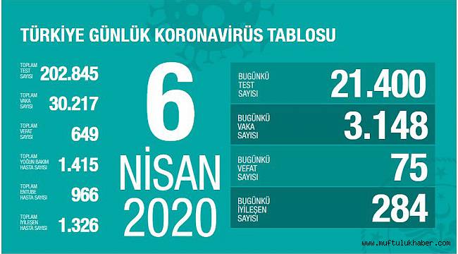 Sağlık Bakanlığından yapılan açıklamada, korona virüs nedeniyle son 24 saatte 75 kişinin hayatını kaybettiği, toplam vefat sayısının 649 olduğu açıklandı. Açıklamada, bugünkü test sayısının 21 bin 400, vaka sayısının ise 3 bin 148 olduğu belirtildi.