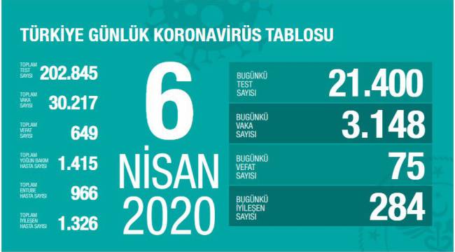 Toplam test sayısının 202 bin 845, toplam vaka sayısının 30 bin 217, yoğun bakım hasta sayısının bin 415, entübe hasta sayısının 966, iyileşen hasta sayısının bin 326 olduğu kaydedildi.Sağlık Bakanı Fahrettin Koca, Twitter hesabından yaptığı paylaşımda, “Günlük test sayımız yakında 30 bini bulacak. İyileşen hasta sayımızdaki artış hızı devam ediyor. Artan test sayısına göre vaka sayısındaki artış düşük seyrediyor. Virüs, gücünü temas ortamından alıyor. Virüse bu fırsatı tanımayalım. Evde kalalım” ifadelerine yer verdi.
