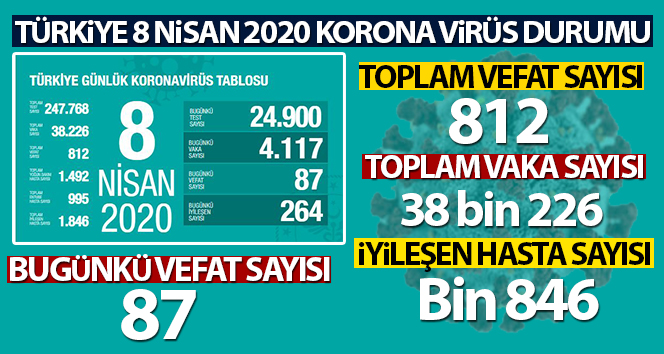 GÜNCEL Yayınlanma: 08 Nisan 2020 - 21:07 Türkiye'de korona virüsten hayatını kaybedenlerin sayısı 812 oldu Türkiye'de korona virüsten hayatını kaybedenlerin sayısı 812 oldu. GÜNCEL 08 Nisan 2020 - 21:07 Yorumlar 1 dk okunma süresi Dinle Yazdır A Büyüt A Küçült Yorumlar EDİTÖR Editör YORUMLAR FACEBOOK adlı kullanıcıya cevap x Gönder ANASAYFAYA DÖNMEK İÇİN TIKLAYINIZ İlginizi Çekebilir Berat Gecesi 2025 Ramazan ayına kaç gün kaldı? Peygamber Efendimiz Berat Gecesi nasıl dua ederdi? Suudi Arabistan Askıya alındığını duyurdu Son Haberler ERBAŞ;"Hayırların en büyüğü bana göre bir yuva kurmaktır" Basın Açıklaması Berat Gecesi 2025 Ramazan ayına kaç gün kaldı? Peygamber Efendimiz Berat Gecesi nasıl dua ederdi? Bakan Akar: 'Hesabını verecekler' Bakan Akar: 'Hesabını verecekler'