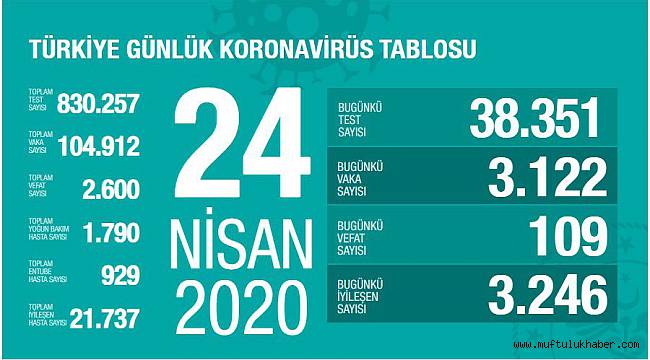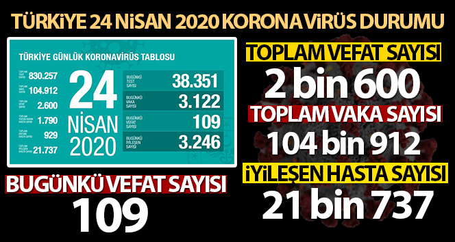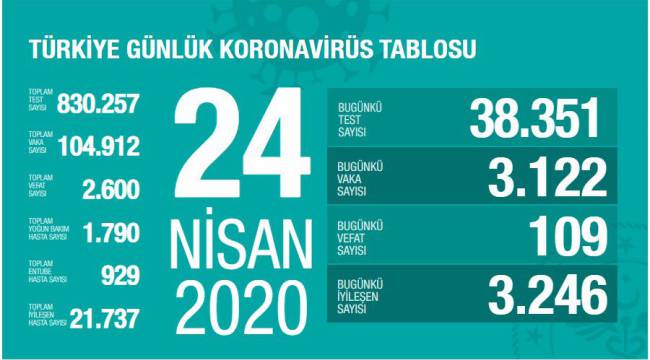 Sağlık Bakanlığı, korona virüse ilişkin 23 Nisan 2020 tarihli son verileri açıkladı. Açıklamaya göre, son 24 saatte 109 kişi korona virüsten hayatını kaybetti, toplam can kaybı ise 2 bin 600 oldu. Bugün toplam 38 bin 351 test yapılırken, 3 bin 122 yeni vaka tanısı kondu, toplam vaka sayısı 104 bin 912 oldu.