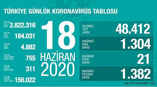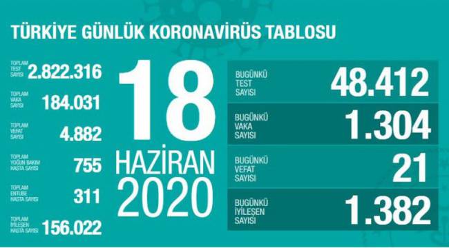 Sağlık Bakanlığından yapılan açıklamaya göre, son 24 saatte 21 kişi korona virüsten hayatını kaybetti, toplam can kaybı ise 4 bin 882 'ye yükseldi. Bugün toplam 48 bin 412 test yapılırken, bin 304 yeni vaka tanısı konuldu, toplam vaka sayısı ise 184 bin 031 oldu. Bugünkü bin 382 kişiyle birlikte toplam iyileşen sayısı da 156 bin 022'e yükseldi. Toplam entübe hasta sayısının 311, toplam yoğun bakım hasta sayısının ise 755 olduğu açıklandı.