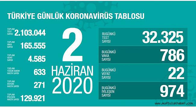 Sağlık Bakanlığından yapılan açıklamaya göre, son 24 saatte 22 kişi korona virüsten hayatını kaybetti, toplam can kaybı ise 4 bin 585'e yükseldi. Bugün toplam 32 bin 325 test yapılırken, 786 yeni vaka tanısı konuldu.Toplam vaka sayısı ise 165 bin 555 oldu. Bugünkü 974 kişiyle birlikte toplam iyileşen sayısı da 129 bin 921'e yükseldi. Toplam entübe hasta sayısının 271, toplam yoğun bakım hasta sayısının ise 633 olduğu açıklandı.“Toplam test sayımız 2,1 milyonu geçti. İyileşen hasta sayımız 130 bin”Sağlık Bakanı Fahrettin Koca, Twitter'dan yaptığı paylaşımda, “Toplam test sayımız 2,1 milyonu geçti. İyileşen hasta sayımız 130 bin. Yoğun bakıma ihtiyaç duyan hasta sayımız azalıyor. Gelecek günler, el hijyenine özene; maske + sosyal mesafe kuralının her ikisine uymamıza bağlı. Daha iyi tedbir, daha iyi sonuçtur” dedi.