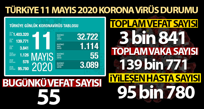 Sağlık Bakanlığından yapılan açıklamaya göre, son 24 saatte 55 kişi korona virüsten hayatını kaybetti, toplam can kaybı ise 3 bin 841 oldu. Bugün toplam 32 bin 722 test yapılırken, bin 114 yeni vaka tanısı konuldu, toplam vaka sayısı ise 139 bin 771 oldu.