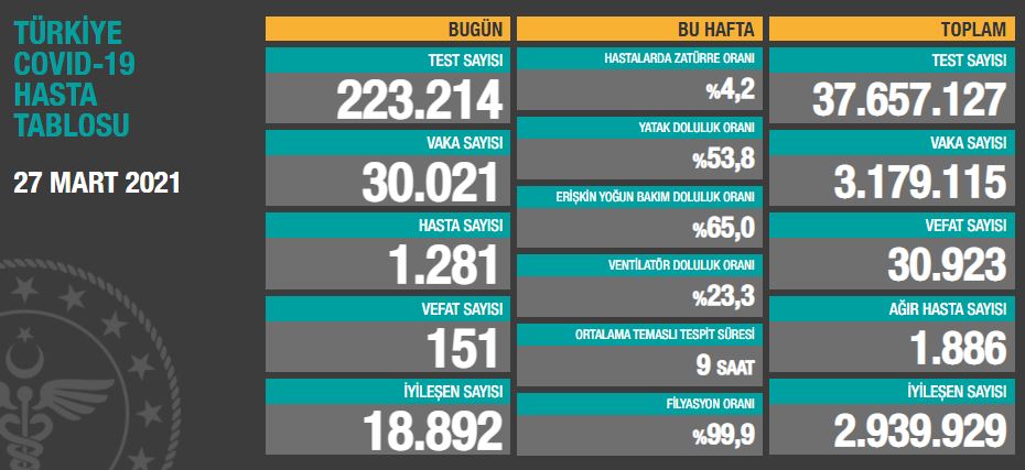 Sağlık Bakanlığının Covid-19 bilgilendirme sayfasında Türkiye'nin güncel korona virüs tablosu kamuoyuyla paylaşıldı. Tabloya göre son 24 saatte 151 kişi korona virüsten hayatını kaybetti, toplam can kaybı 30 bin 923'e yükseldi.Toplamda 37 milyon 657 bin 127 test yapıldı. Bugün yapılan 223 bin 214 testten, 30 bin 21 yeni vaka sayısı, bin 281 kişi de yeni hasta sayısı olduğu belirtildi.Toplam vaka sayısının 3 milyon 179 bin 115 olduğu, bugün iyileşen 18 bin 892 kişiyle birlikte toplam iyileşen hasta sayısının 2 milyon 939 bin 929'a yükseldiği, toplam hastalarda zatürre oranının yüzde 4,2, ağır hasta sayısının ise bin 886 olduğu açıklandı.