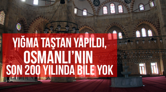 Camilerinin kaplama olmayan ve yığma adı verilen usulle yapılan bir cami olduğunu belirten Sipahi, “Camimizin özelliği, ecdadımızın yapmış olduğu gibi has taş dediğimiz kesme taşla yapılmış olan, kaplama olmayan yığma dediğimiz usulle yapılan tek eser oluşu. Ben bunu hep Cumhuriyet dönemimizin bu şekildeki tek eseri diyordum ama sonra biraz daha araştırınca Osmanlı’nın son 200 yılında da yok bu hacim de yığma taşla, bu usulle yapılan bir eser. Bu 2 bin 588 metre kapalı alanı olan 130 santim duvar kalınlığı olan, 16 metre duvar yüksekliği olan, 38 metre kubbe yüksekliği olan ve 70 metrede minare yüksekliği olan bir cami” dedi.