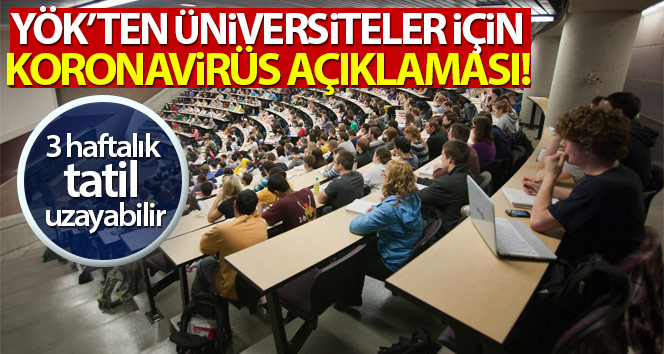 Yükseköğretim Kurulu Başkanlığı (YÖK) tarafından üniversitelerin idari ve akademik personel hariç, öğrenciler için 3 hafta kesintisiz tatil edildiği öğrenildi. Tatil sürecinde öğrenciler için uzaktan eğitim programı devreye alınmayacak. Ayrıca, korona virüs tedbirleri kapsamında Türkiye'de bulunan tüm üniversitelerin alacağı önlemler YÖK koordinasyonunda gerçekleştirilecek. Üniversitelere gönderilecek üst yazıyla birlikte tüm sosyal etkinliklerin durdurulması kararı verildi.