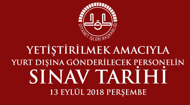 Yetiştirilmek amacıyla yurtdışına gönderilecek personel sınavı, 13 Eylül 2018 Perşembe günü Saat 15:00'da Diyanet İşleri Başkanlığı merkezinde gerçekleştirilecektir. Sınava müracaat eden adaylar, Sınav Giriş Belgelerini 07 Eylül 2018 Cuma gününden itibaren DİBBYS sistemi üzerinden alabileceklerdir.